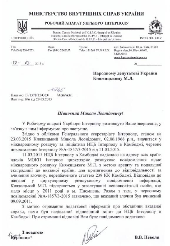 В марте на сайте Интерпола появилась информация о том, что нардеп Николай Княжицкий разыскивается за совершение изнасилования в Камбодже. Об этом сам политик узнал 20 марта. Нардеп направил запрос рабочему аппарату Укрбюро Интерпола. В ответ пришло официальное сообщение, где значится, что в 2011 году в столице Камбоджи – городе Пномпень – произошло изнасилование несовершеннолетнего лица. Данные в Интерпол со стороны Камбоджи поступили лишь 11 марта 2015 года.