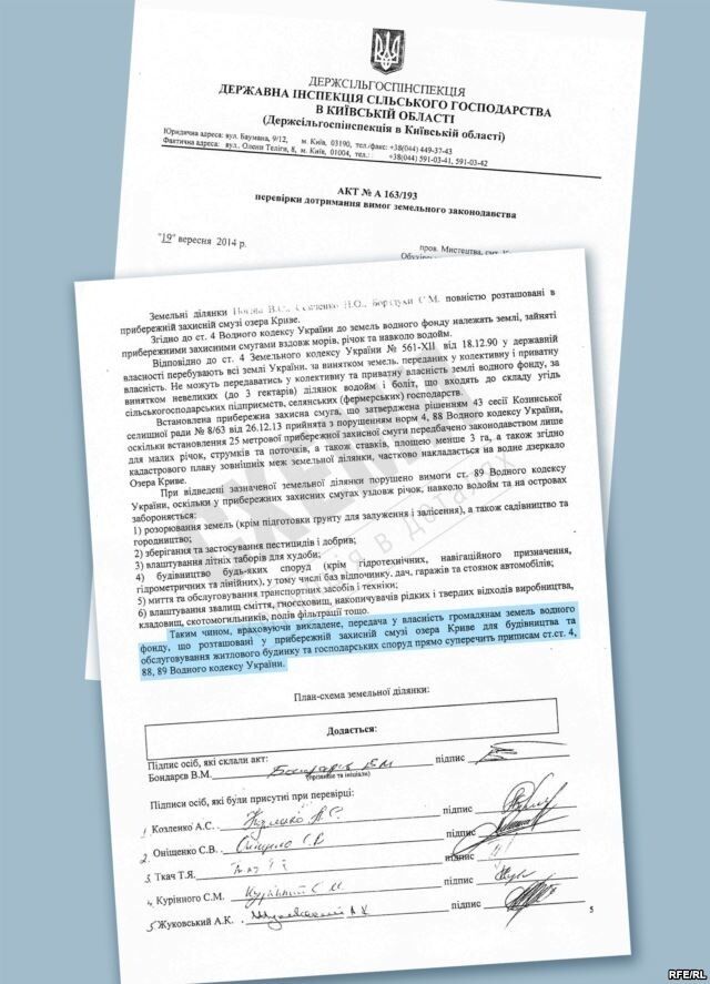 Инспекторы установили, что при передаче земель и строительстве нарушены статьи 4, 88 и 89 Водного кодекса Украины, согласно которым "в прибрежных защитных полосах вдоль рек, вокруг водоемов и на островах запрещается строительство любых хозяйственных построек".