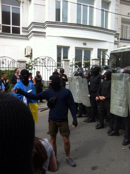 Из-под Лавры митингующие пришли к консульскому отделу российского посольства на улицу Панфиловцев. Здание охраняет милиция. Один из участников событий Александр Рудоманов пишет в Facebook, что в сотрудников МВД активисты бросали зеленые орехи. Журналист Мэтью Люксмур, который также находится на месте событий, утверждает в Twitter, что протестующие бросались неспелым виноградом. Милиции больше, чем активистов, сообщают очевидцы. Позже Рудоманов написал, что милиция всех пропустила, "никакого нападения на консульство не было, все спокойно, человек около тридцати".