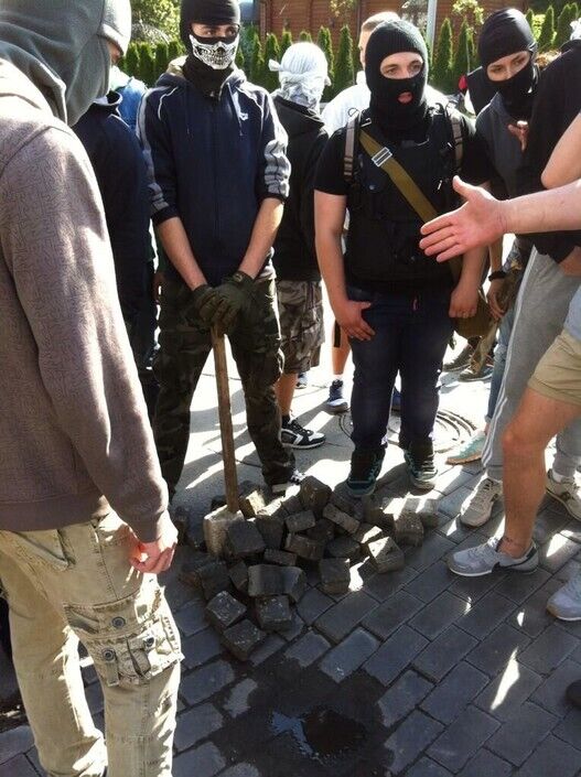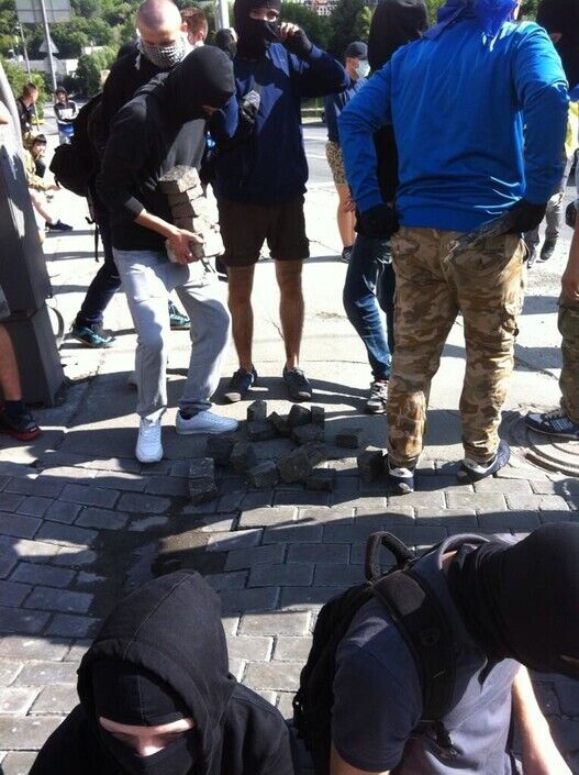 Участники пикета под Киево-Печерской лаврой разгромили отдел Сбербанка России на улице Мазепы возле метро "Арсенальная". Митингующие забросали здание брусчаткой и петардами, разбили окна. Внутрь помещения они не заходили.