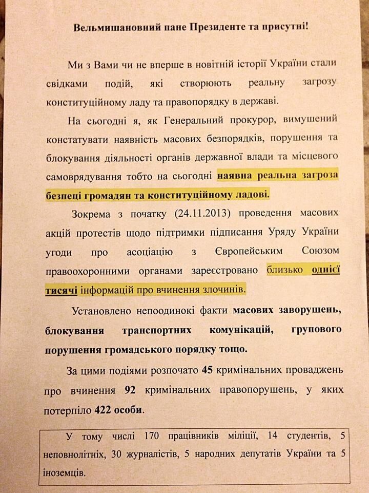 Известный украинский журналист Мустафа Найем опубликовал в своем Facebook документы из архива экс-генпрокурора Виктора Пшонки. В них Пшонка настоятельно требовал от Януковича ввести в Украине чрезвычайное положение не меньше, чем на 30 дней.
