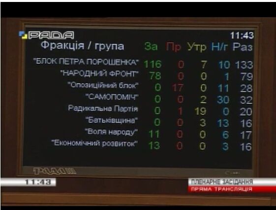 "За" проголосовали 116 народных депутатов от фракции Блока Петра Порошенко, 78 – от фракции "Народного фронта", 13 – от группы "Экономическое развитие" и 11 – от группы "Воля народа". "Самопоміч", Радикальная партия и "Батьківщина", которые вместе с Блоком Петра Порошенко и "Народным фронтом" входят в коалицию, не дали за документ ни одного голоса.