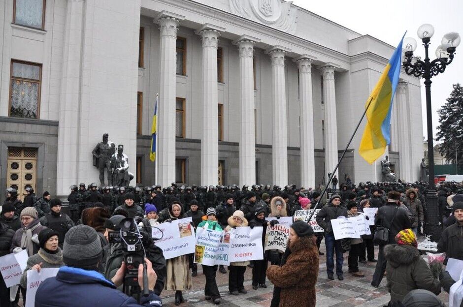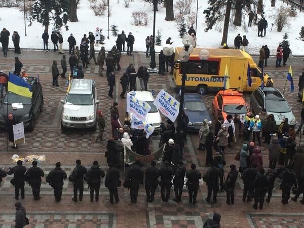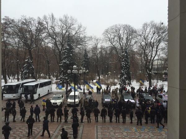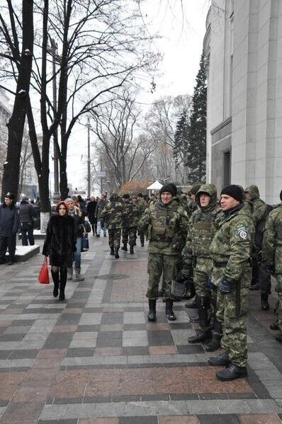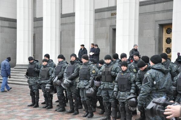 С утра в четверг, 27 ноября, под стенами Верховной Рады собрались несколько сотен активистов, в частности, из Автомайдана и партии "Свобода". Как написал в Twitter пресс-секретарь киевской ячейки партии Александр Аронец, свободовцы проводили свой митинг против тех народных депутатов, которые голосовали за так называемые диктаторские законы 16 января и были избраны вновь. У Рады были усилены меры безопасности. По периметру здания стояли около 30 автобусов с силовиками. Кроме того, сотрудники милиции в полном обмундировании охраняли вход в парламент. Никаких стычек между митингующими и правоохранителями не происходило.