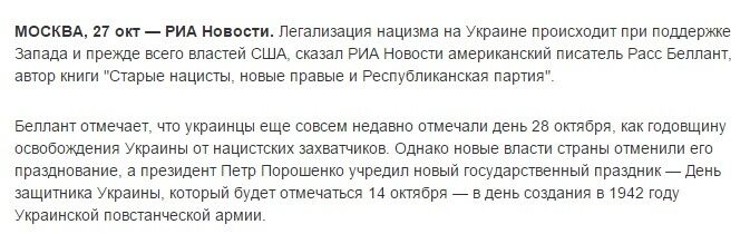 РИА "Новости" распространило неправдивый комментарий американского журналиста и писателя Расса Белланта, в котором он сообщает об отмене в Украине празднования годовщины освобождения от нацистских захватчиков.