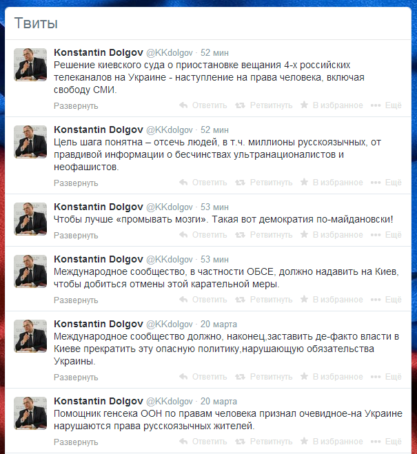 Уполномоченный МИД России по вопросам прав человека, демократии и верховенства права Константин Долгов считает решение суда о приостановке вещания четырех российских телеканалов в Украине наступлением на права человека и призывает ОБСЕ "надавить на Киев".