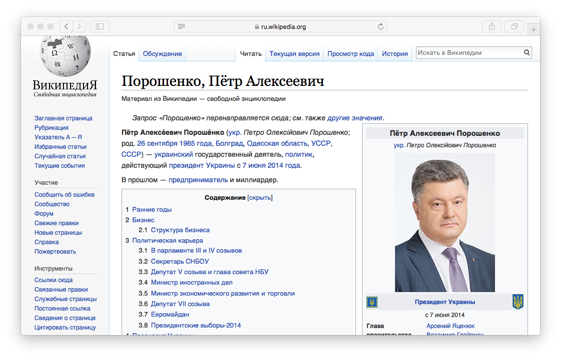На самой странице Порошенко в "Википедии" такой информации не было.