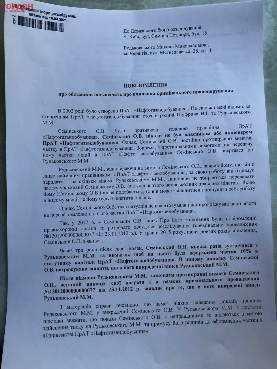 В документе Рудьковский обвиняет Семинского в вымогательстве. Он пишет, что Семинский "никогда не был собственником или акционером "Нефтегаздобычи", но постоянно и противоправно требовал долю" в компании.