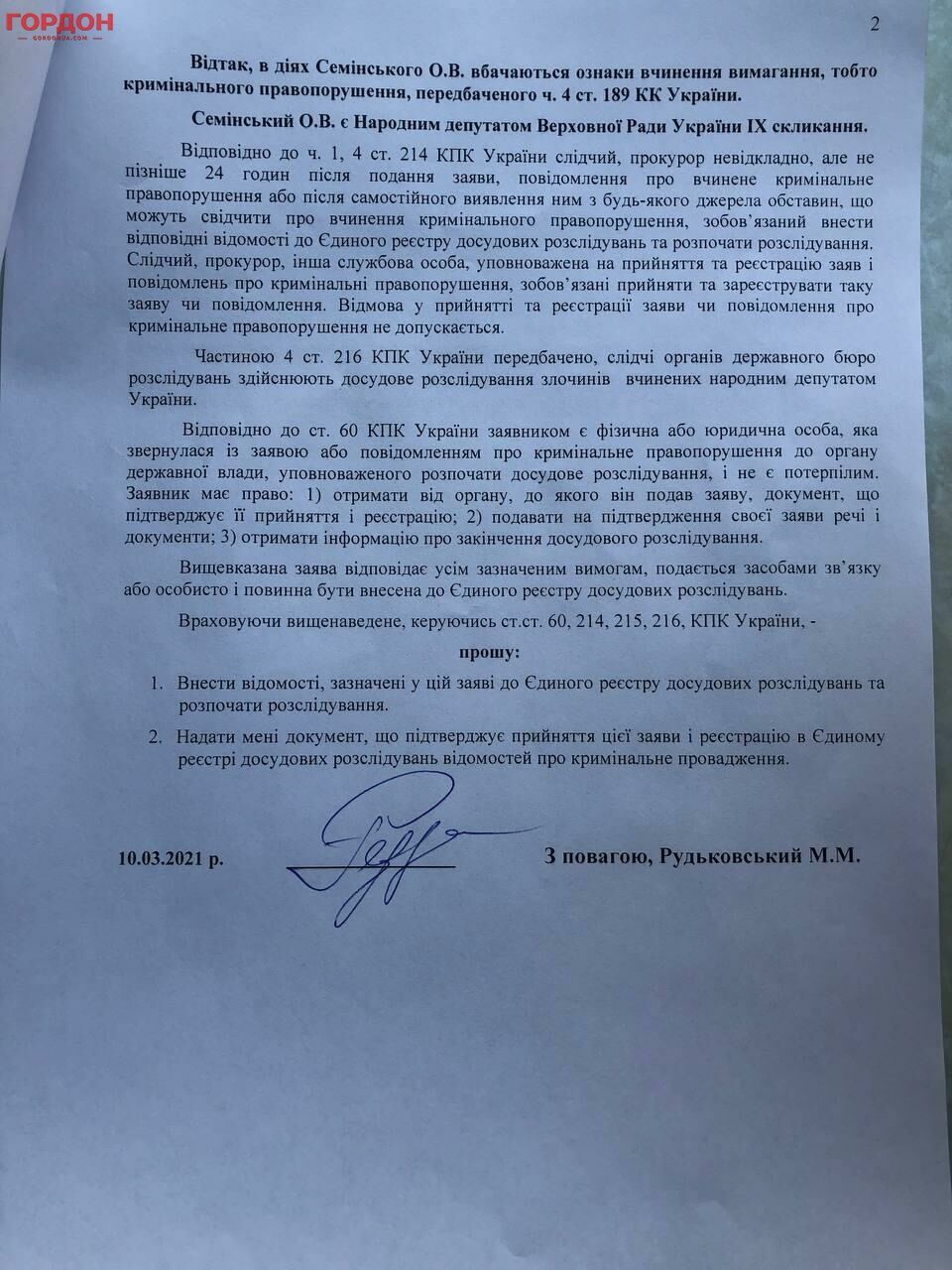 7 марта Рудьковский рассказал, что написал письмо президенту Украины Владимиру Зеленскому, в котором снова заявил о своей невиновности по этому делу. В этом письме Рудьковский сообщил, что 5 марта в 11.00 Семинский вместе с заместителем генпрокурора и еще одним нардепом от "Слуги народа" были у президента Украины Владимира Зеленского и обсуждали с ним уголовное производство.