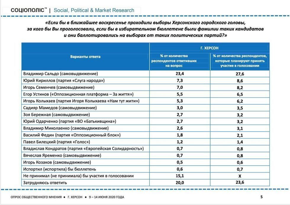 За бывшего мэра Херсона Владимира Сальдо на выборах городского головы высказали готовность проголосовать 23,4% среди всех опрошенных и 27,6% среди тех, кто планирует принять участие в голосовании.