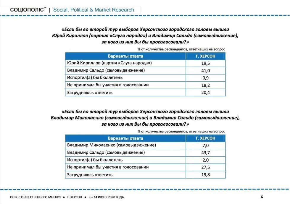 В потенциальном втором туре Сальдо обходит Кириллова с результатом 41% и 19,5% соответственно. Вторым потенциальным оппонентом Сальдо был действующий мэр Херсона Владимир Миколаенко, которого поддержали 7% респондентов против 43,7% в пользу Сальдо.