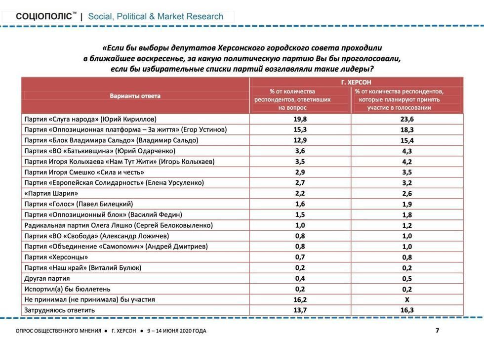 Согласно результатам социологического исследования компании "Социополис", опубликованным 30 июня, самый высокий избирательный рейтинг на выборах городского головы сейчас у бывшего мэра города Владимира Сальдо.