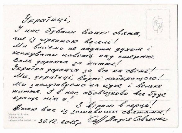 "Олег, Александр, держимся! 20 лет для вечности – ничто! А мы уже вошли в вечную память нашего народа! Выстоим всем врагам на зло! Гореть им, мразям, в аду", – написала Савченко на открытке с картой Украины.