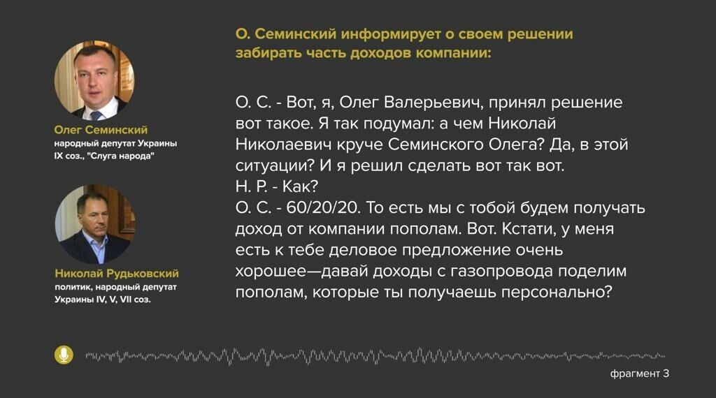 Речь идет о частной газодобывающей компании "Нефтегаздобыча", в которой Семинский когда-то был директором. Издание опубликовало записи его разговоров с Рудьковским, на которых Семинский заявлял, что самовольно стал забирать себе часть доходов компании и претендовал на переход с менеджерской должности на получение доли в ней.
