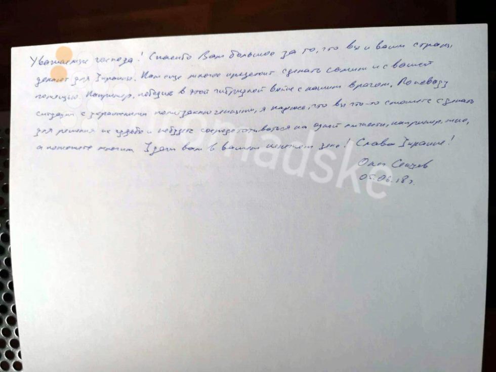 "Уважаемые господа, спасибо вам большое, что вы и ваши страны делают для Украины. Нам еще многое предстоит сделать самим и с вашей помощью. Например, победить в этой гибридной войне с нашим врагом. По поводу ситуации с украинскими политзаключенными: я надеюсь, что вы что-то сможете сделать для их судьбы и не будете сосредотачиваться на одной личности, например, мне, а поможете другим. Удачи вам в вашем нелегком деле. Слава Украине!"– написал он.