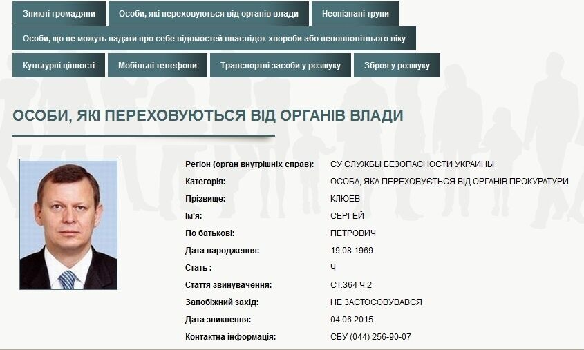 Министерство внутренних дел Украины объявило в розыск народного депутата Сергея Клюева как лицо, которое скрывается от органов прокуратуры.