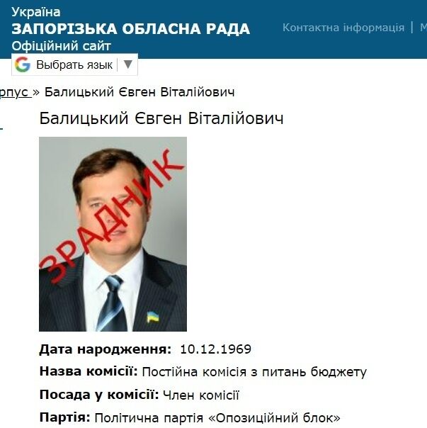 "Предатель Евгений Балицкий почему-то до сих пор имеет мандат депутата облсовета. Он публично поддержал российскую оккупацию. Он добровольно пошел на сотрудничество и занял должность "руководителя" оккупационной администрации РФ. [...] Но почему-то формально он до сих пор остается с депутатским мандатом Запорожского областного совета", – говорится в сообщении.