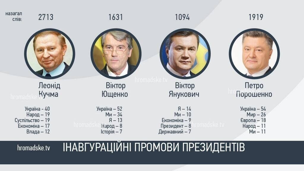 Единственным из четырех глав государств, который практически не вспоминал об Украине в торжественной речи, был Виктор Янукович. Согласно исследованию, он имел самую короткую инаугурационную речь, состоящую только из 1094 слов, и при этом чаще всего (14 раз) в его выступлении упоминалось слово "я". Всего на одно упоминание "последней буквы алфавита" ему уступает Виктор Ющенко, однако у третьего главы государства слово "Украина" было также самым часто употребляемым.