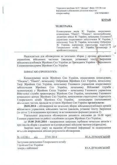 По словам собеседника издания, собрания проводил замначальника Генштаба генерал-лейтенант Юрий Думанский, который требовал, чтобы все присутствующие единогласно поддержали обращение к Януковичу.