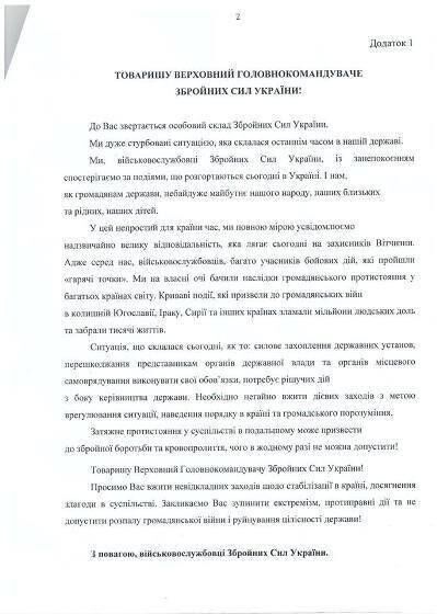 В тексте обращения идет речь о том, что "военнослужащие обеспокоены ситуацией, сложившейся в стране, и просят Главнокомандующего принять действенные и неотложные меры для наведения порядка, сохранения страны, и предотвращения в дальнейшем экстремизма".