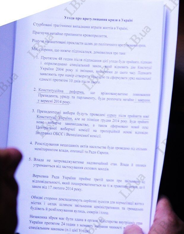 Копия "мирного" договора власти и оппозиции, которое сегодня до восьми утра обсуждалось лидерами оппозиции на встрече с Виктором Януковичем, оказалась в распоряжении LB.ua.