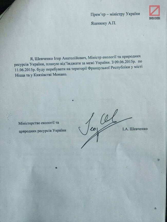 Издание INSIDER опубликовало письмо министра экологии Украины Игоря Шевченко на имя премьера Арсения Яценюка, в котором он сообщал, что 9–11 июня будет находиться за рубежом, но глава Кабмина якобы не дал ему такого разрешения.