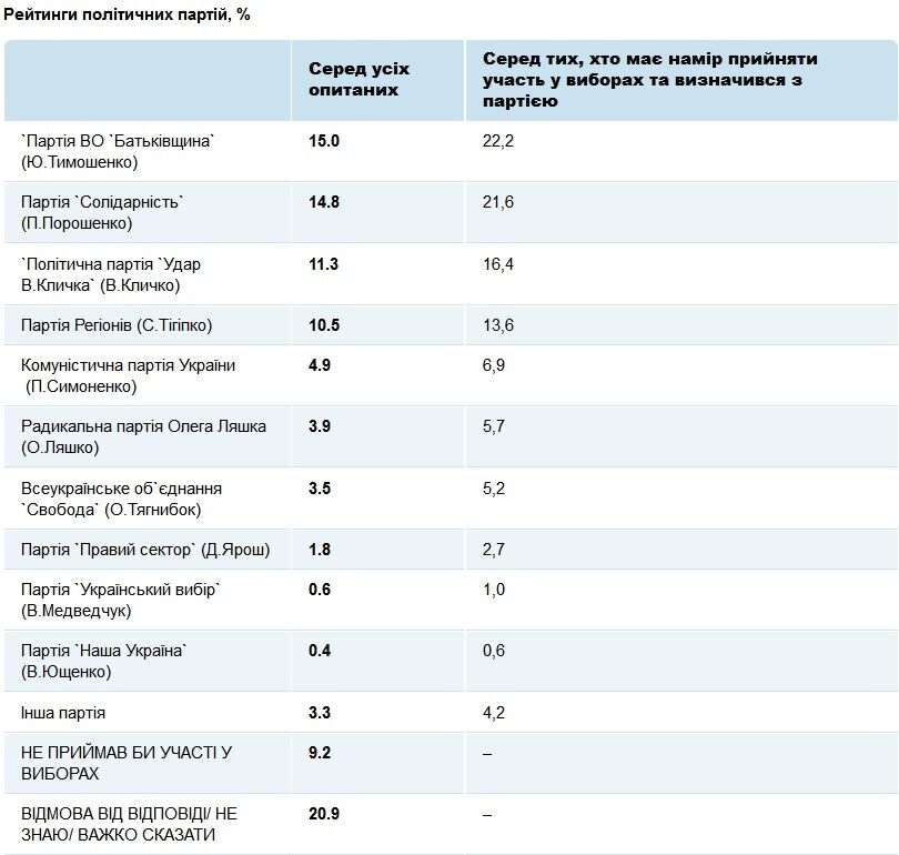 Так, первое место на выборах получила бы ВО "Батьківщина" во главе с Юлией Тимошенко (15%), второе – партия Петра Порошенко "Солидарность" (14,8%), третье – УДАР Виталия Кличко (11,3%), четвертое – Партия регионов с Сергеем Тигипко во главе (10,5%).