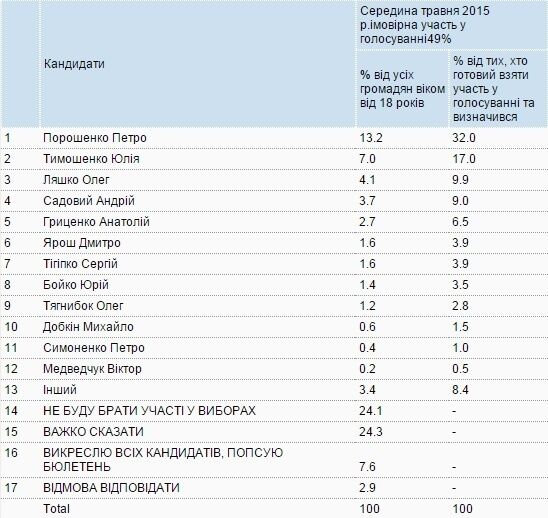 Среди тех, кто точно пришел бы на избирательные участки, за Порошенко готовы проголосовать 32%, за его ближайшего конкурента Тимошенко – почти в два раза меньше, 17%.