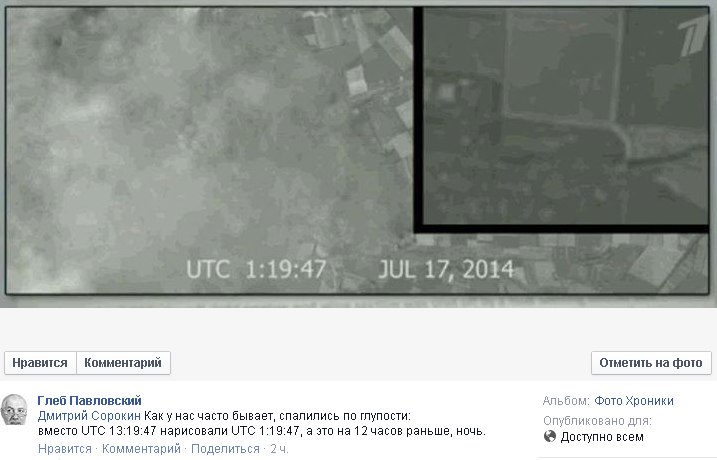 Кроме самой фотографии, журналисты напутали со временем, сообщил пользователь Facebook Дмитрий Сорокин. "Как у нас часто бывает, спалились по глупости: вместо UTC 13:19:47 нарисовали UTC 1:19:47, а это на 12 часов раньше, ночь", – написал он.