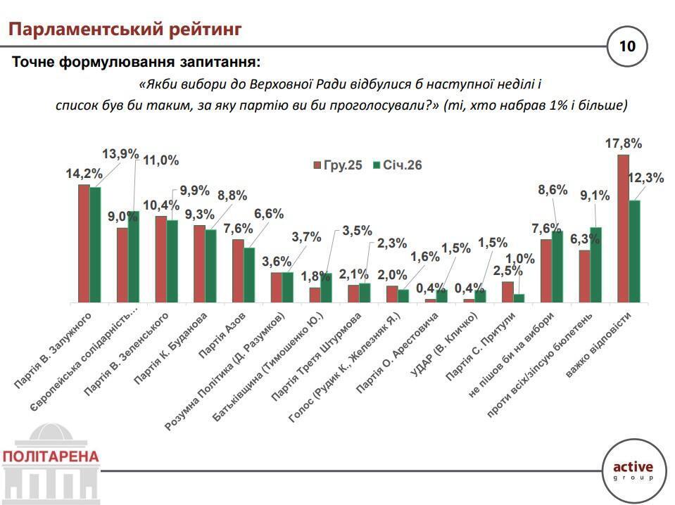 "Наивысший уровень поддержки среди партий, преодолевающих проходной порог, получила потенциальная "Партия Валерия Залужного" (13,9%). Далее с незначительным отрывом идут "Европейская солидарность" (11,0%), "Партия Владимира Зеленского" (9,9%) потенциальная "Партия Кирилла Буданова" (8,8%)", – свидетельствуют результаты опроса.