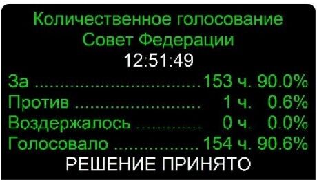 Соответствующее решение поддержали 153 из 154 членов Совета Федерации России.