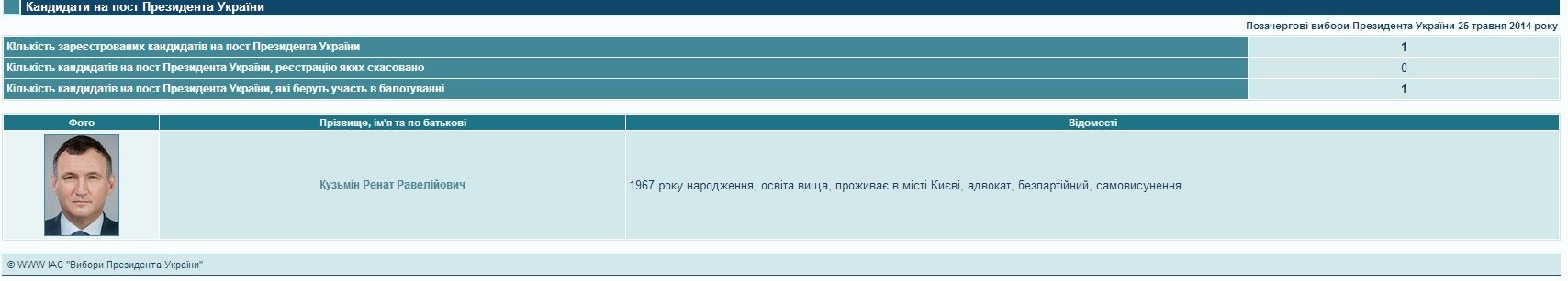 На сегодняшний день единственным кандидатом в президенты на сайте ЦИК значится бывший первый заместитель генпрокурора Ренат Кузьмин. Экс-губернатора Харьковщины, который уже подал документы в комиссию, пока не зарегистрировали.