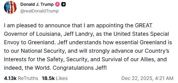 Американский президент Дональд Трамп в ночь на 22 декабря "с радостью" сообщил в Truth Social о назначении губернатора Луизианы Джеффа Лэндри спецпосланником США в Гренландии.