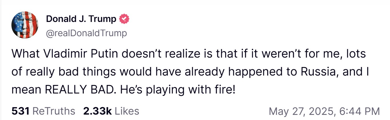 После разговора с Путиным 19 мая Трамп заявил, что Россия и Украина "немедленно начнут переговоры о прекращении огня и, что важнее, войны". Кроме того, глава Белого дома сказал, что пока не будет ужесточать антироссийские санкции.