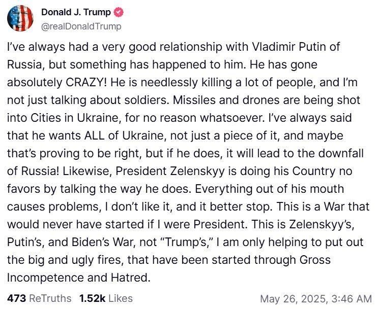 Позже Трамп написал в Truth Social на эту тему, снова упомянув, что был "в хороших отношениях с Путиным, но с ним что-то произошло".
