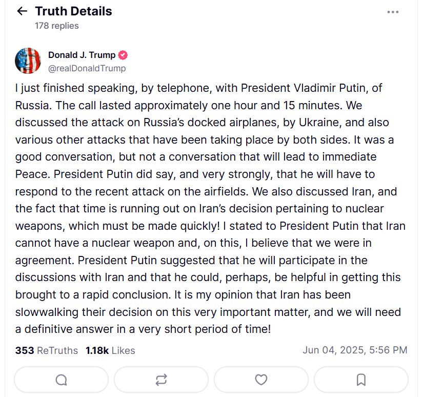 В нем Трамп процитировал слова Путина о том, что ему якобы придется ответить на атаки Украины на военные аэродромы в тылу России.