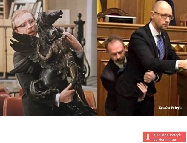 Интернет-пользователи увидели сходство в том, как Барна нес Яценюка и как герой фильма "Служебный роман" Анатолий Новосельцев нес статуэтку коня.