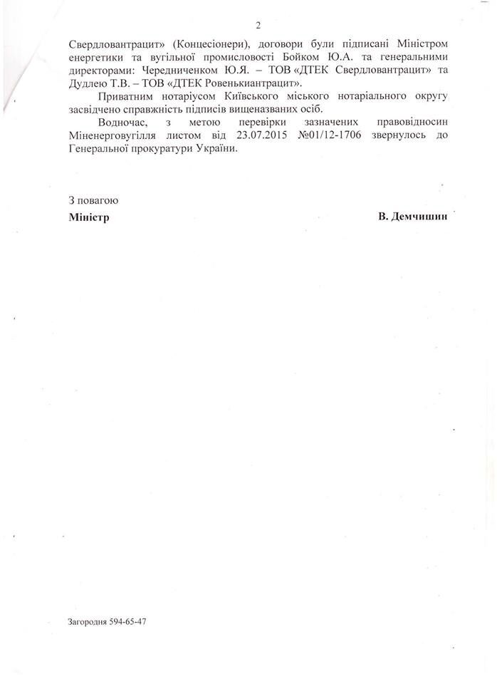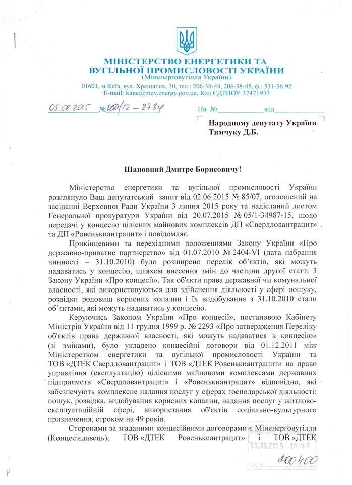 "В конце июня 2015 года группа ИС опубликовала небольшое расследование относительно "нехороших нюансов" передачи в 2011 г. государственных предприятий ГП “Ровенькиантрацит” и ГП “Свердловантрацит” (крупнейшие в Украине добытчики антрацита) в концессию господину Ахметову (ДТЭК) на 49 лет... На мой депутатский запрос (на основе этого расследования) относительно того, не желает ли новое руководство Минэнергетики внимательно изучить и пересмотреть данный "концессионный договор", в министерстве мне ответили, что, дескать, согласно внесенным при Януковиче изменениям в законодательство в этой истории вроде как все законно. Что более радует, руководство Минэнергетики, как следует из ответа, все же обратилось к Генпрокуратуре с просьбой таки разобраться в этой мутной истории. Ждем решения ГПУ", – написал Тымчук.
