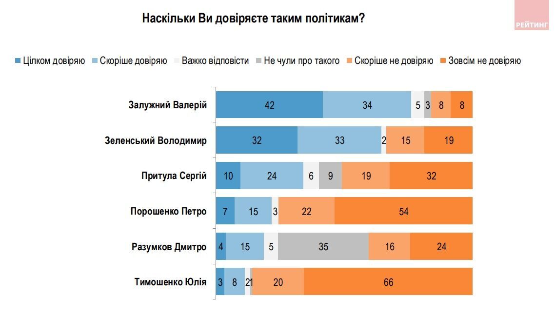 "Валерию Залужному доверяют 76%, не доверяют – 16%, Сергею Притуле доверяют 34%, не доверяют – 51%, Петру Порошенко доверяют 22%, не доверяют – 76%, Дмитрию Разумкову доверяют 19%, не доверяют – 41%, Юлии Тимошенко доверяют 11%, не доверяют – 86%", – отметили социологи.