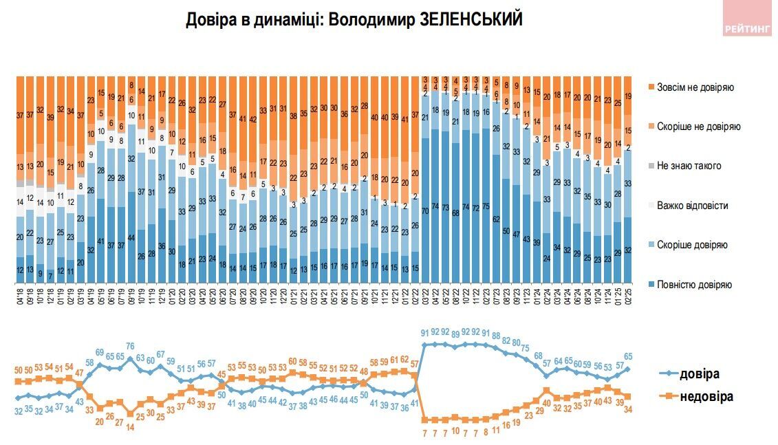 "Рейтинг" также показал уровень доверия к Зеленскому за последние семь лет. Согласно ему, рейтинг президента вырос после начала полномасштабного вторжения РФ в феврале 2022 года – 92%. В ноябре 2024 года уровень доверия упал до 53%, но с тех пор он только растет.