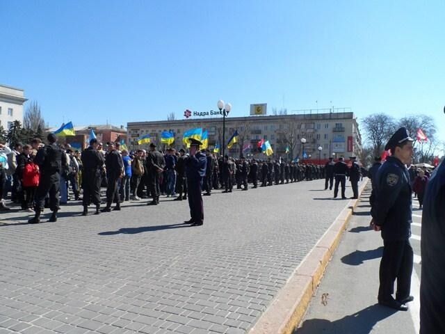 Активисты местного Евромайдана собрали больше трех тысяч сторонников целостности Украины. Друг от друга митингующих отделяли милиционеры, но евромайдановцы заняли почти всю площадь Свободы, и херсонские коммунисты оказались зажаты Евромайданом с двух сторон.