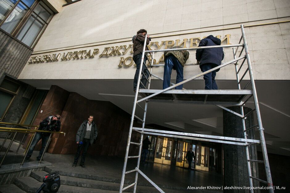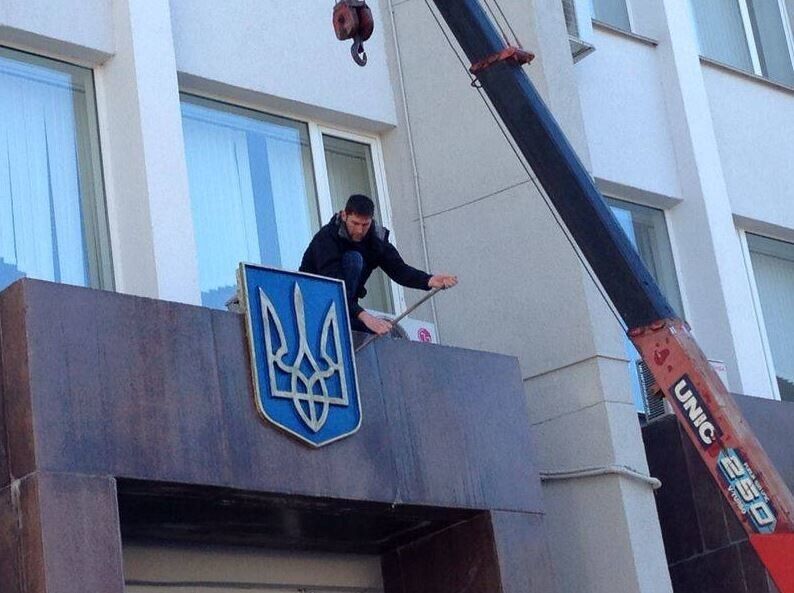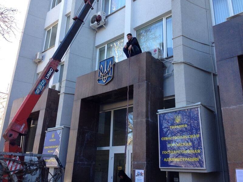 С админзданий по всему полуострову начали снимать украинские тризубы и флаги. Кроме того, с фасада здания парламента Крыма демонтировали надпись "Верховный Совет Автономной Республики Крыма", сделанную на трех языках – украинском, крымскотатарском и русском. Сейчас на нем написано "Государственный совет Республики Крым" и висит флаг РФ.