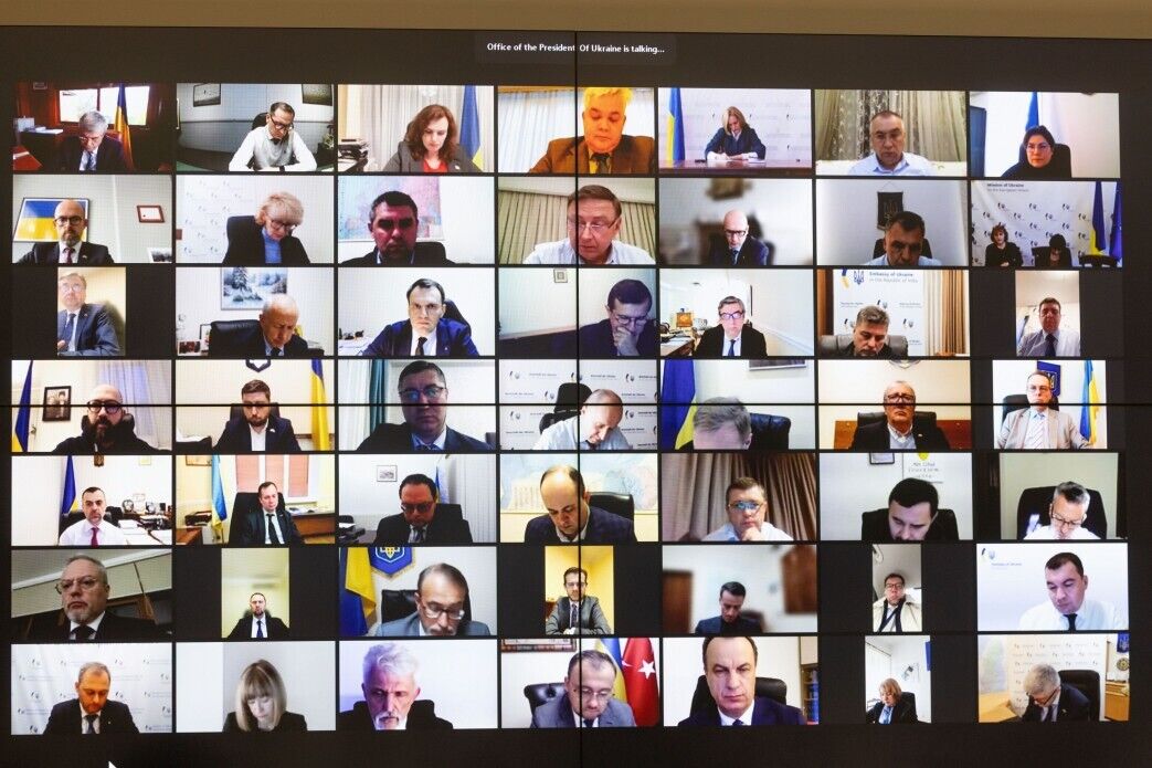 В совещании приняли участие министр иностранных дел Украины Дмитрий Кулеба и его заместитель Николай Точицкий, заместитель руководителя ОП Игорь Жовква и советники Дарья Заривна и Александр Бевз. Послы, судя по опубликованным ОП фото, участвовали во встрече онлайн.