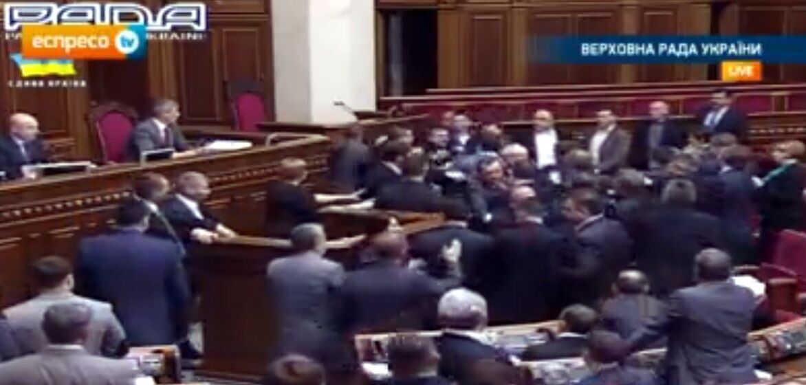 К трибуне немедленно подскочили несколько депутатов-свободовцев. Симоненко отскочил и спрятался за спинами своих коллег по фракции. Началась драка. И.о. президента Украины и спикер парламента Александр Турчинов объявил перерыв на 10 минут.