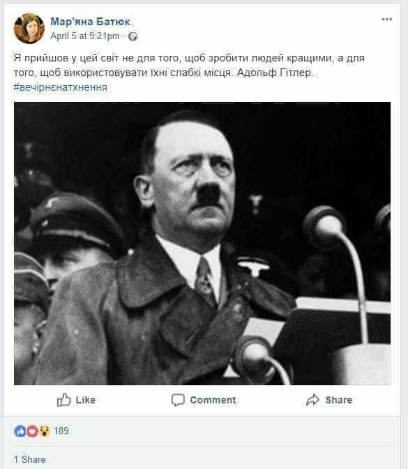 В сообщении о Гитлере, которое появилось на странице Батюк утром 20 апреля, было написано: "Великий человек, как ни крути". Были также приведены цитаты из книги Гитлера "Моя борьба". На данный момент публикация на странице депутата отсутствует.