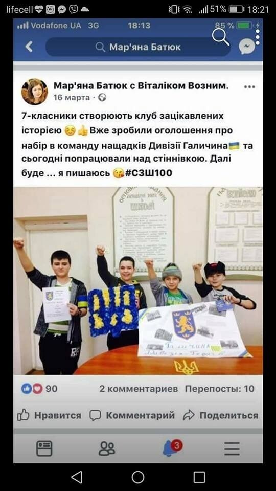 Батюк пишет, что на фотографии – семиклассники львовской школы №100, которые "создают клуб интересующихся историей" и сделали объявление "о наборе в команду потомков дивизии "Галичина" (дивизия СС "Галичина". – "ГОРДОН").