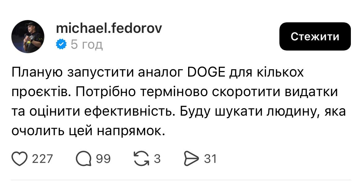 Первый вице-премьер-министр Украины – министр цифровой трансформации Михаил Федоров планирует создать департамент, который станет аналогом департамента DOGE, созданного в США для сокращения расходов и бюрократии и повышения эффективности правительства. Об этом 18 июля Федоров написал в соцсети Threads.