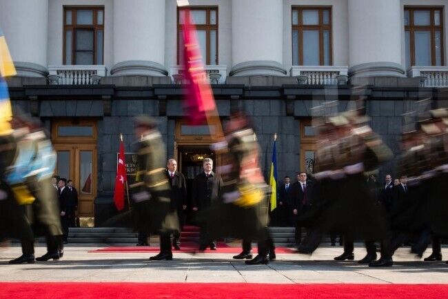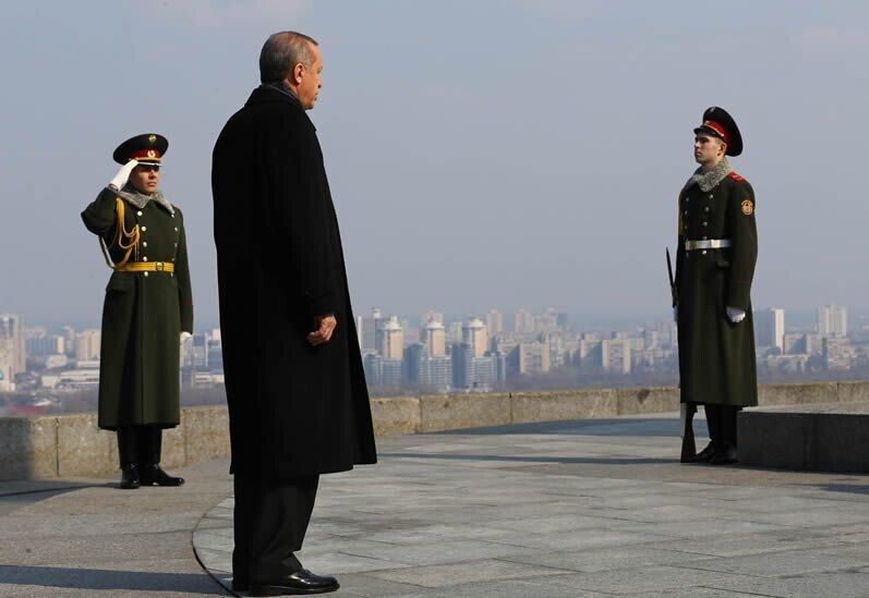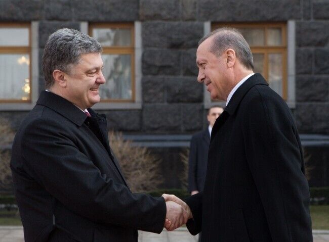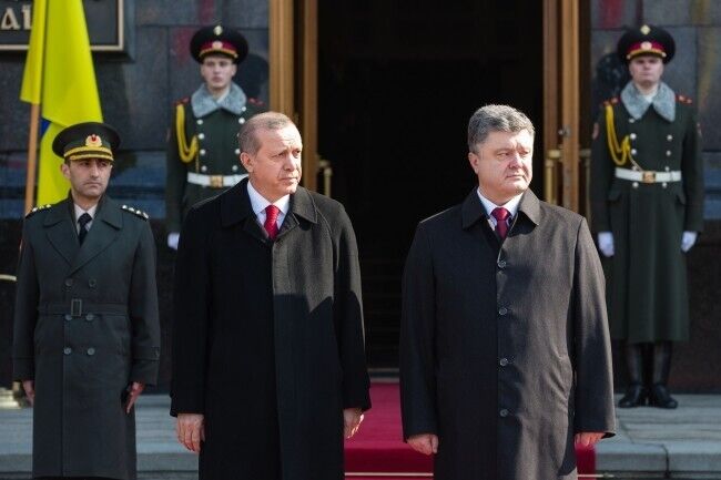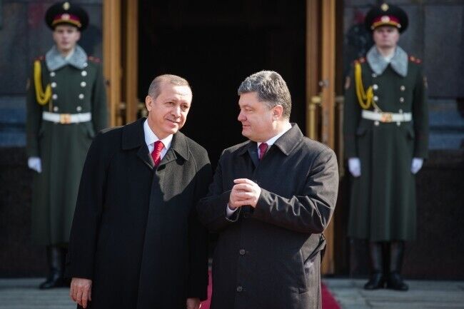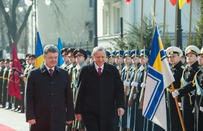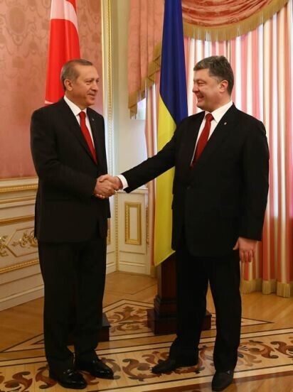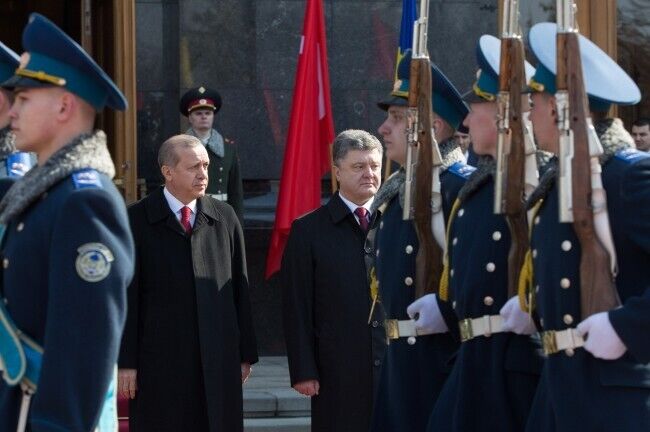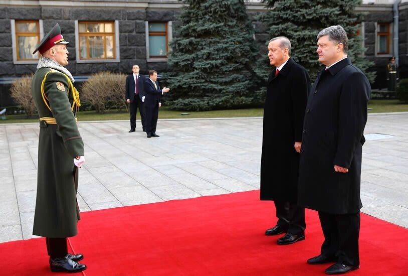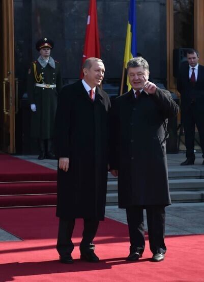 В пятницу, 20 марта, в Украину с официальным однодневным визитом прибыл президент Турции Реджеп Эрдоган. Президент Украины Петр Порошенко встретил Эрдогана возле Администрации Президента на улице Банковой. Встреча глав двух государств длилась, по словам пресс-секретаря Порошенко, три часа. Перед поездкой на Банковую Эрдоган возложил венок к могиле Неизвестного солдата в парке Славы.