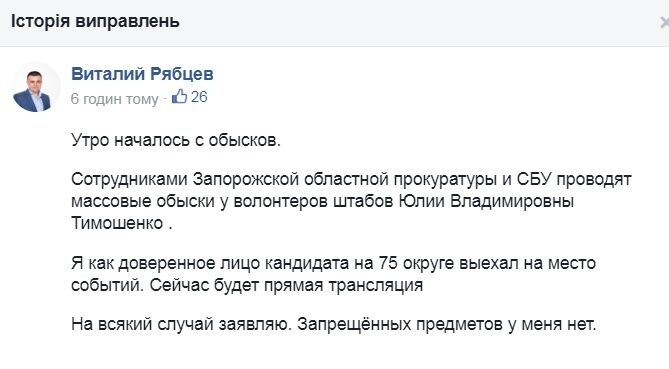 Позже Рябцев отредактировал свое сообщение и написал, что прокуроры инициировали получение судебных постановлений на обыски у "сторонников "Батьківщини" по личному поручению [генпрокурора Украины] Юрия Луценко".