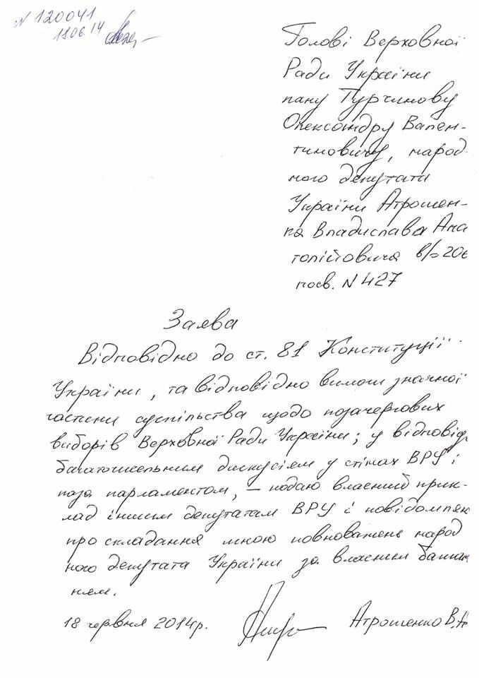 "Написал и зарегистрировал заявление о сложении полномочий народного депутата Украины. Убежден: в стране должны состояться внеочередные выборы! О них нужно не говорить, а не бояться идти на них и честно отчитываться о своей работе", – написал Атрошенко.