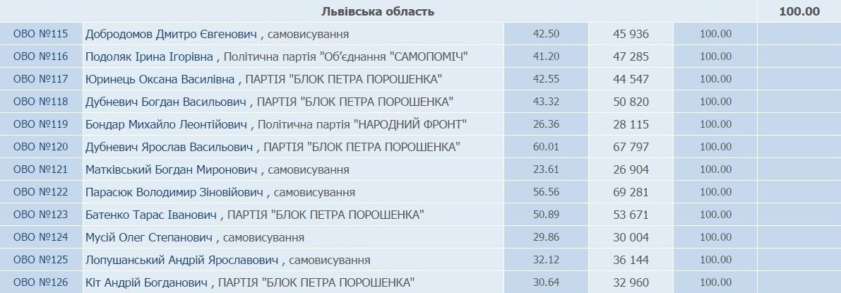 В Верховную Раду от Львовской области проходят пять кандидатов от Блока Петра Порошенко, по одному – от "Народного фронта" и "Самопомочі", а также пять самовыдвиженцев.